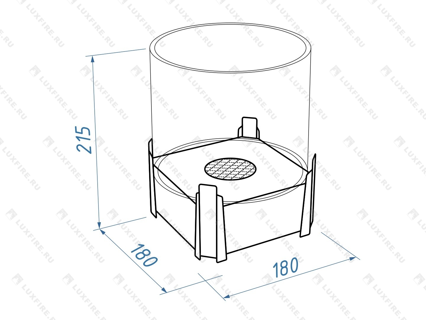 Представляет собой металлический внешний корпус с встроенным топливным блоком Lux Fire 150-2 на декоративных ножках в виде Щита. Огонь ограничивается стеклянным закаленным плафоном диаметром 180 мм.