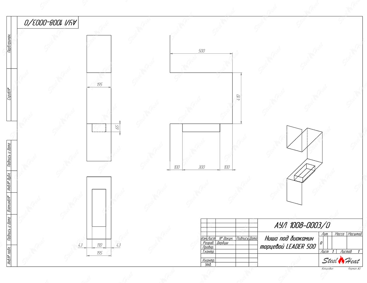 Встраиваемый Биокамин торцевой SteelHeat Leader 500предназначен для встраивания в глухие ниши из гипсокартона, кирпича, пеноблоков, бетона.