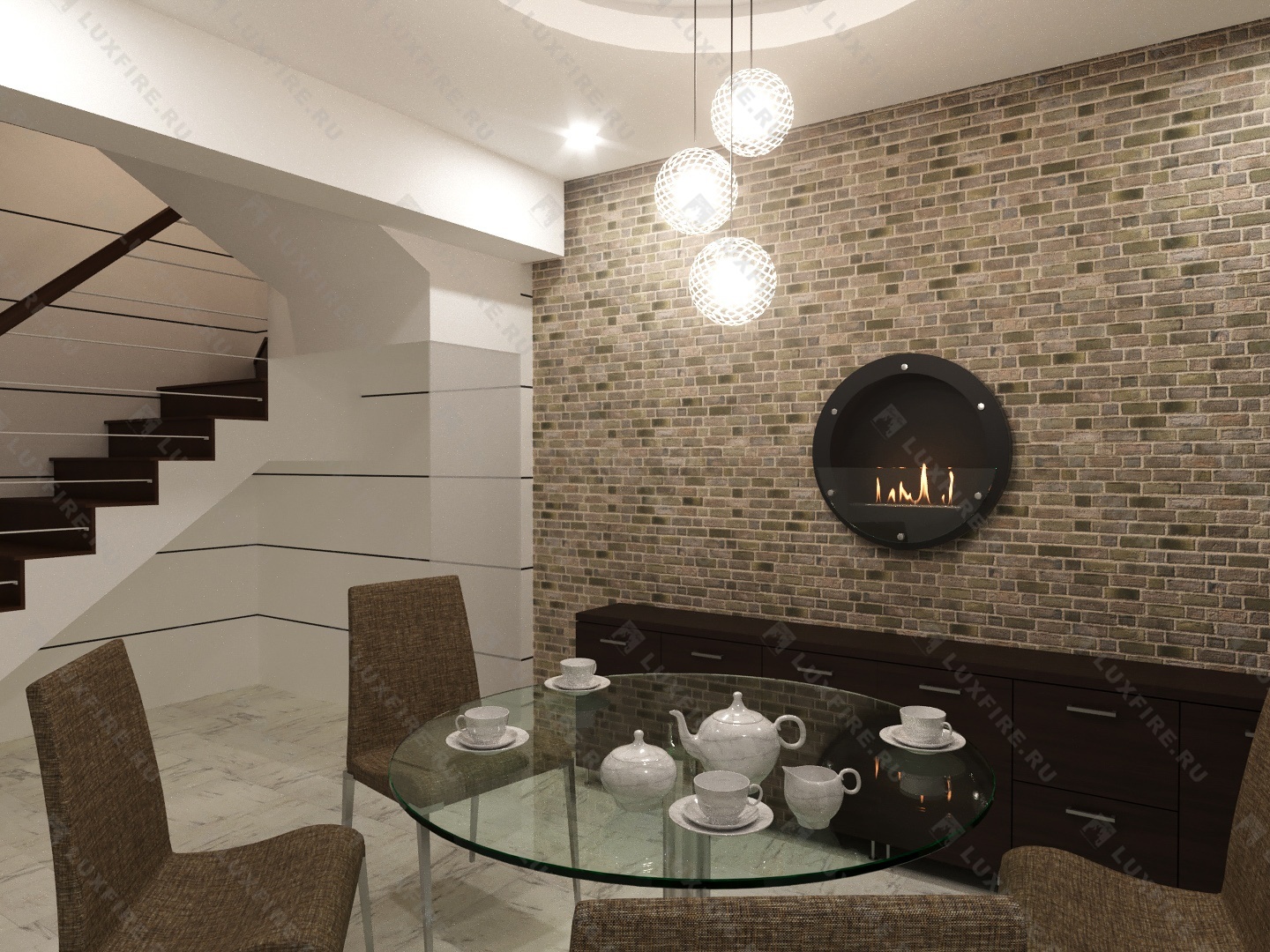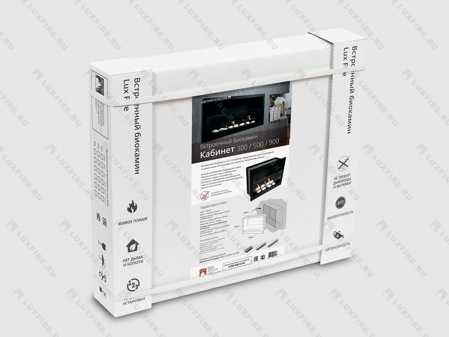 Представляет собой встраиваемую сборную сквозную металлическую конструкцию круглой формы класса S, создающую полузакрытое безопасное пространство для огня с топливным блоком Lux Fire 500 S ограниченную закаленным стеклом в котором горит живой огонь с углом обзора 180 градусов. Универсально подходит для встройки в нишу или подвеса на стену.